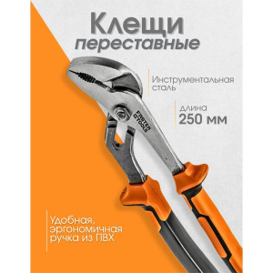 Клещи переставные выполнены из инструментальной стали. Клещи обеспечивают точную регулировку для оптимальной подгонки под различные размеры деталей. Удобная эргономичная ручка сделана из ПВХ, что обеспечивает комфорт работы. -