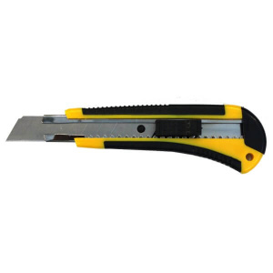 ОписаниеНож используется для резки бумаги, картона, линолеума, кожи и пр. Изделие оснащено сегментированным лезвием, металлической направляющей и двухкомпонентным корпусом из пластика и резины. Замена лезвия легко производится путем снятия заглушки в хвостовой части ножа. Инструмент обладает функцией автоматической фиксации лезвия.